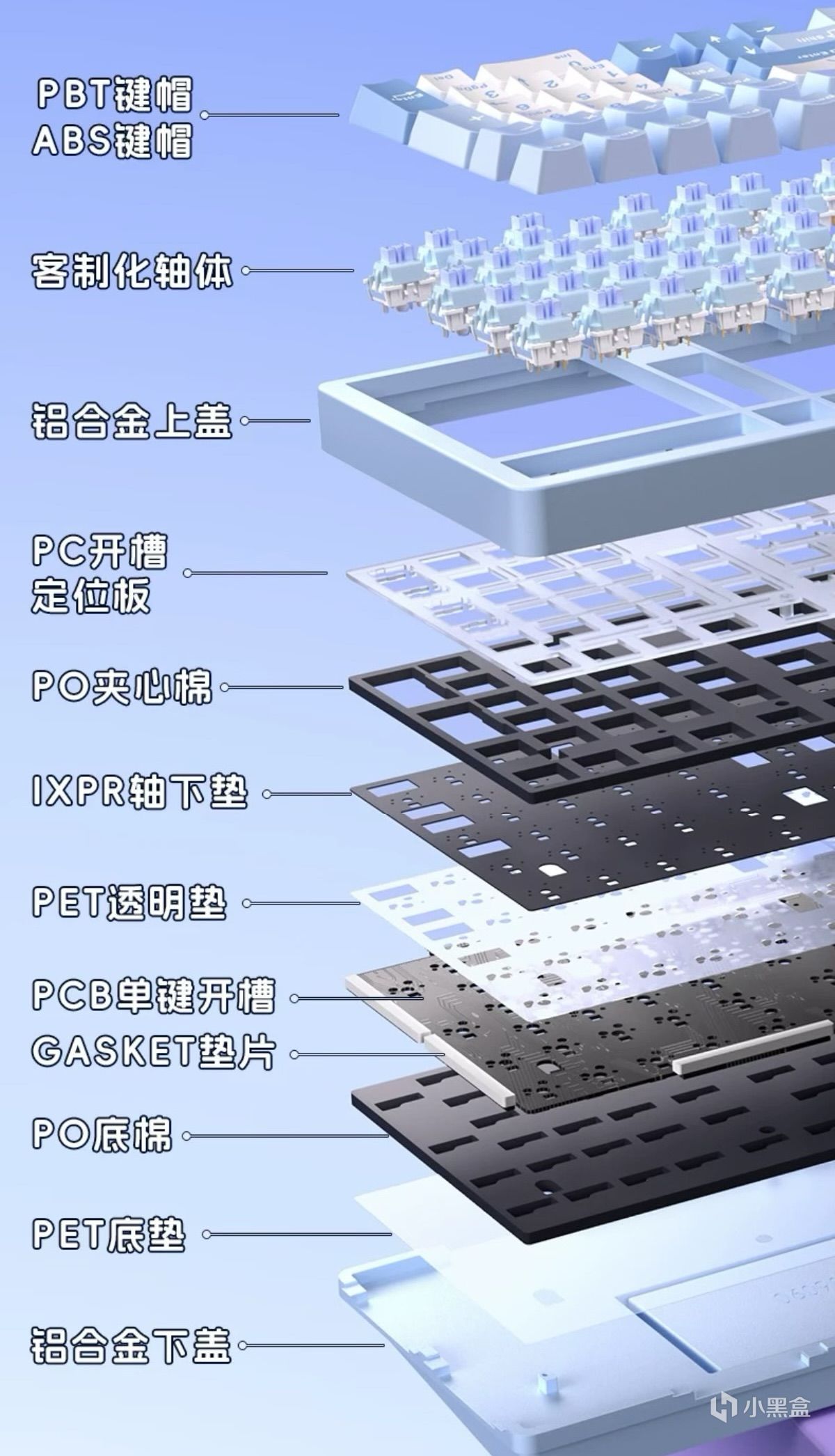 首先,就是这个五层内胆堆叠的Gasket结构了,通过开槽定位板、PO棉、轴下垫、底垫加PET透明底垫的五层堆叠,Hi98Pro不仅可以让声音更集中,还能让Gasket结构更有弹力,透光均匀,手感更稳。