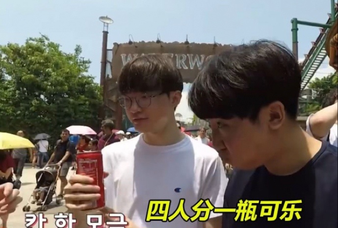 這是S9小組賽後,SKT四個隊員在外面旅遊,因天氣炎熱,faker居然主動提出要請大家喝可樂,最後隊友沒想到是一瓶可樂四個人分。