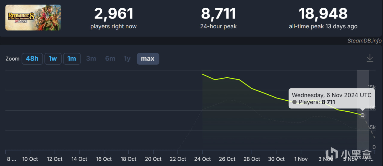 最近有两部争议很大的作品一前一后问世,一个是生软Bioware的《龙腾世纪:影障守护者》,另一个则是光荣特库摩的《三国志8 Remake》。尽管这两部作品口碑都非常一言难尽——DA4的Steam好评率是73%,8RE更是只有48%,但它们的在线人数也着实不少:前者峰值达到了8W9,今天仍旧有5W+在线;后者则稳定在了1W左右,相比峰值的近2W比起来玩家流失率并不高。