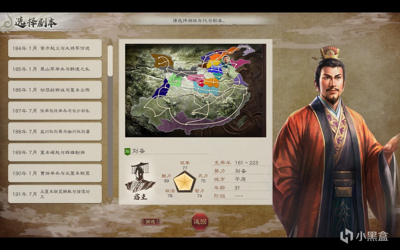另一方面,《三国志8RE》的剧本数量也堪称是历史之最,从184年黄巾起义开始到263年三国结束,几乎每个年份都设置了剧本,并且玩家可以任意选择武将开局,根据你选择武将的不同还会给你安排不同身份——君主、都督、太守、军师、普通、在野六种身份听上去是不是很炫酷!