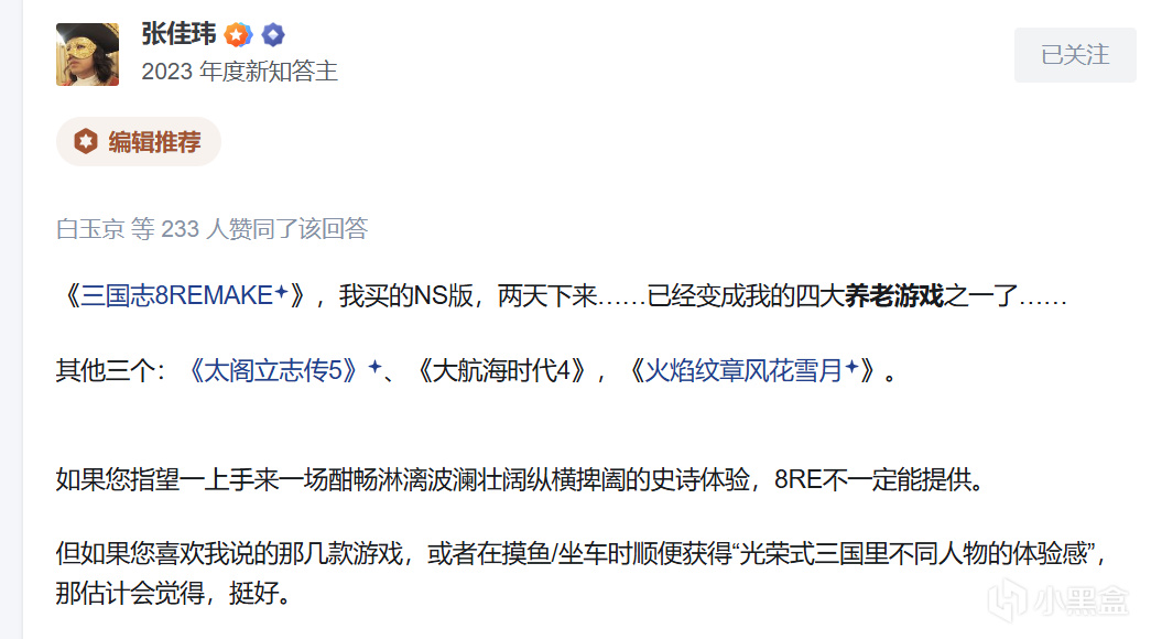 那说了这么多缺点、难道《三国志8RE》都找不到一点好吗?显然也不是。我在知乎翻看这款游戏的讨论,也有不少玩家表达了赞赏,你说是光荣水军吗?暗耻早就没空管这些事了,其中不乏著名大V张佳玮的“自然水”,看得出老粉确实对本作的情怀不一样。