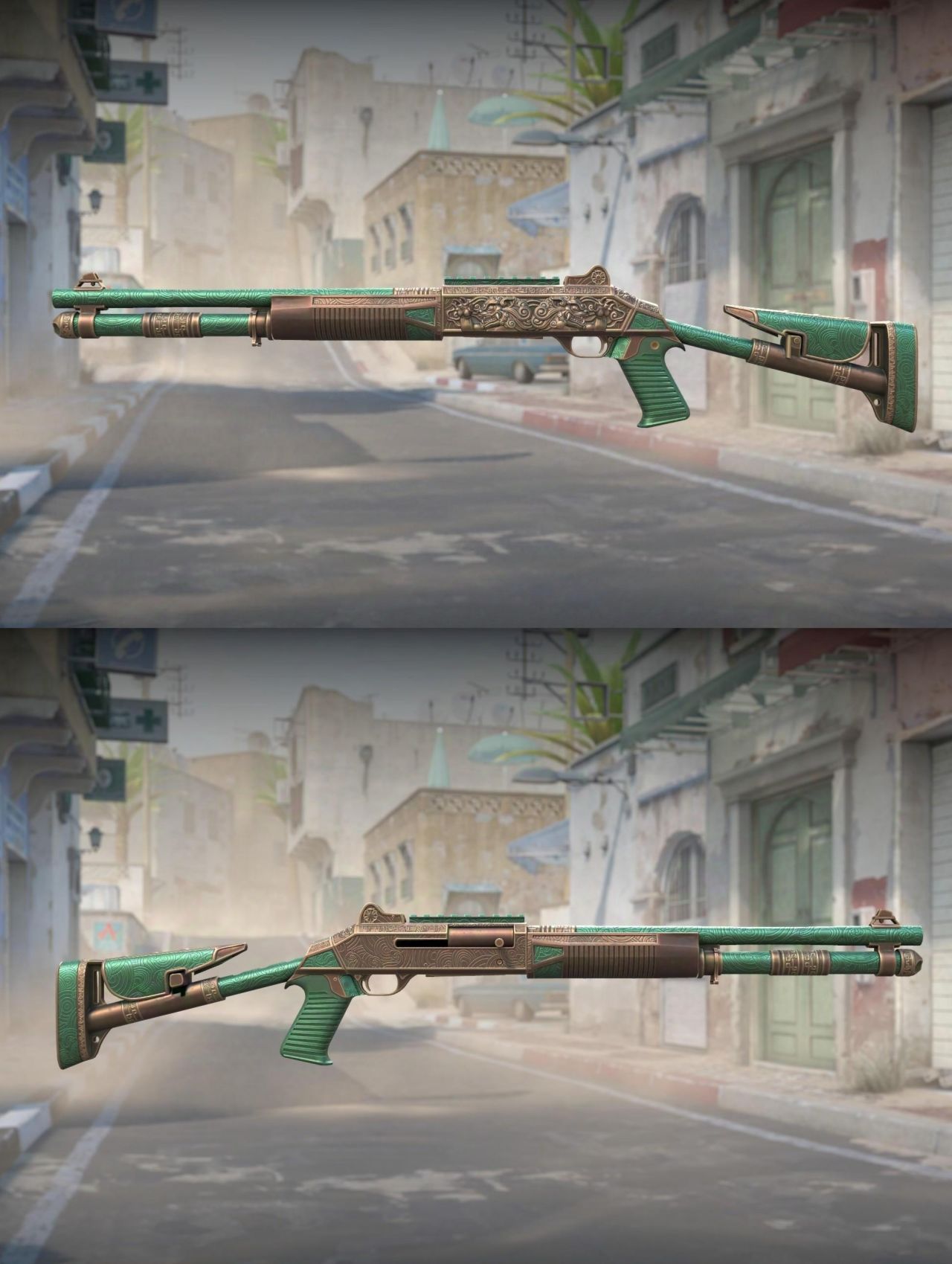喜歡浮雕的朋友看過來,槍身浮雕工藝,綠色和銅色包裹很有質感,戰痕槍身圖案像是生起了一層綠鏽,有種青銅的感覺,不過顏色分佈不均勻,還是推薦略磨。