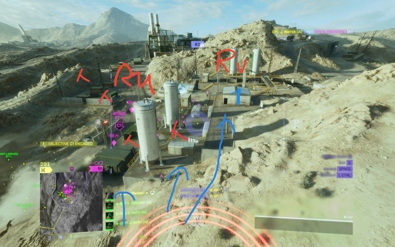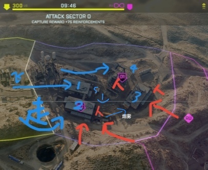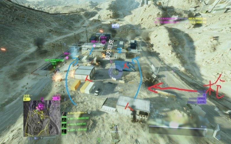 关键在于1,2号位高台,拿下了高台控制权基本就宣告拿下了b区,推荐用扎因可以有效清除前点房间内敌人,随后封烟来到1,2号位台下抢点。因为太混乱所以写了人字附近的点位都是敌人扎堆的地方。土鸡兵可以在高台上扔c5炸下面的人。防守方如果有坦克进入图示位置,b区就会成为最难的区域之一,比删瘾还难攻,这张图载具没有什么特别好的点位掩体少,低打高俯角都是问题