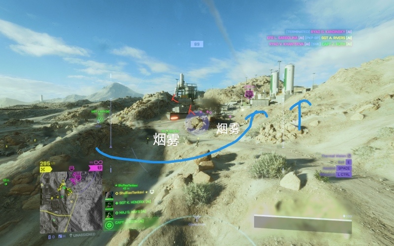 基本所有重要敌人点位都以红色的人标出,敌人聚集在左侧山坡,点里面,按蓝色路线走可以比较安全的进点,1号位路线可以高打低点里敌人,1号位屋里架回防。