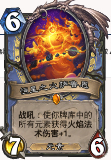 免費版元素法和付費版元素法的區別就在於帶不帶【恆星之火薩魯恩】這張卡,隨從法傷+1甚至只是火焰法術,咋一看平平無奇,但是配合上溢流熔岩我們就可以做到4費火焰法術+7的逆天效果,帶流水也能讓我們4費就給隨從上好buff。