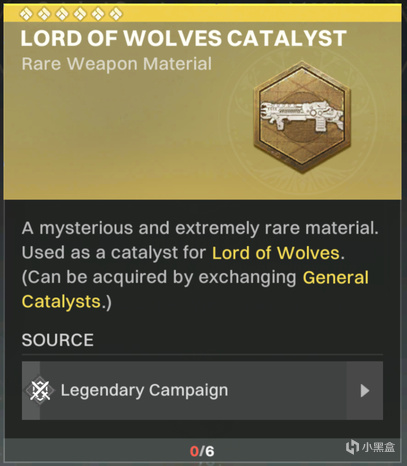 其中異域武器的催化劑除了擊殺數量外需要從傳說戰役收集6個催化劑碎片(每一把4%幾率),此外還有部分活動會給通用異域武器催化劑碎片,可以用於任意異域武器。