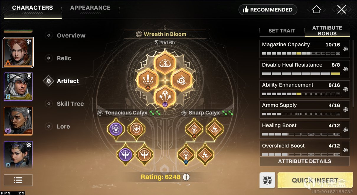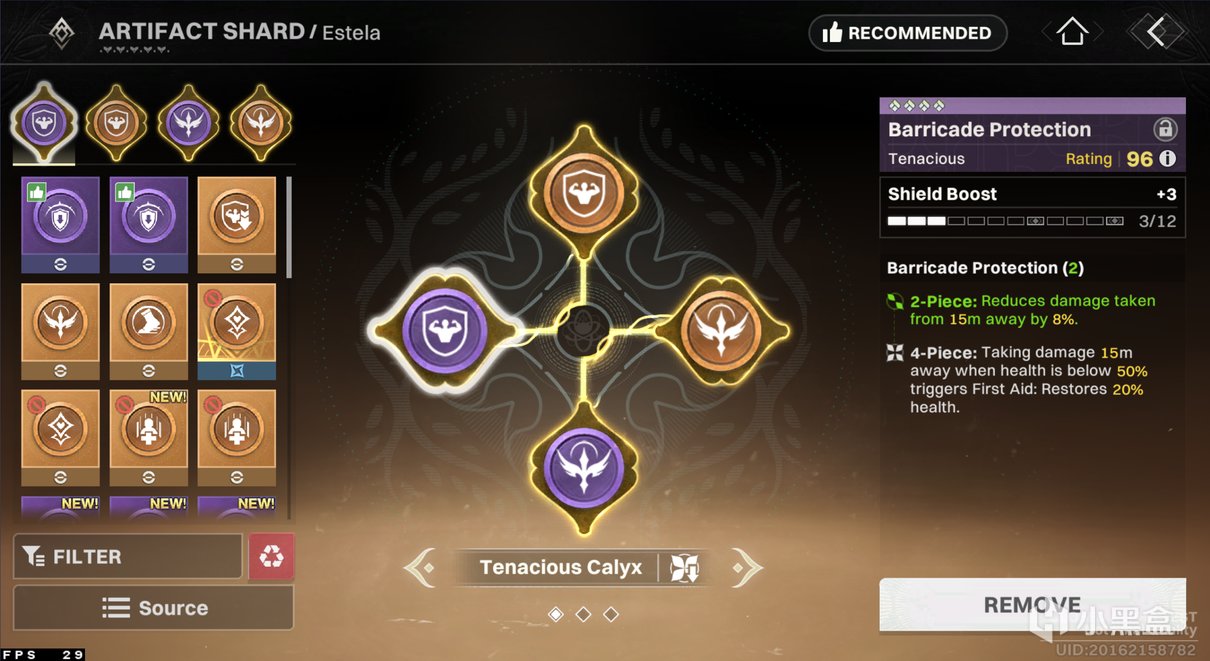 角色擁有類似於米哈遊“聖遺物”的裝備系統,稱之爲神器 Artifact,並且同樣有套裝效果。命運崛起的聖遺物分爲增加被動特效的“頑強花萼”(左下角)、增加屬性傷害的“鋒利花萼”(右下角),和各種強力特殊效果的“綻放花朵”(正上方)。以上圖爲例,頑強花萼的“屏障防護”套裝,2件套降低15米內受到的傷害8%,4件套15米內受到的傷害使生命低於50%後會觸發急救特效,恢復20%生命。鋒利花萼的“精英殺手”套裝,2件套提高對強力戰員傷害15%,4件套受到強力戰員傷害降低15%。綻放花朵“雪上加霜”,使用自動步槍、脈衝步槍、微型衝鋒槍造成傷害,每3次命中可以使下一發子彈變爲220%傷害的爆炸彈。