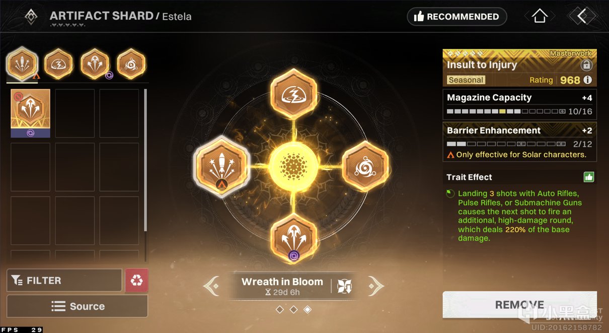 其中綻放花朵類的聖遺物比較特殊,前面兩個套裝刷出來之後是永久性質的,而綻放花朵則是賽季神器,雖然每一個效果都非常強力,但是賽季結束後就會消失,需要刷新的賽季神器。