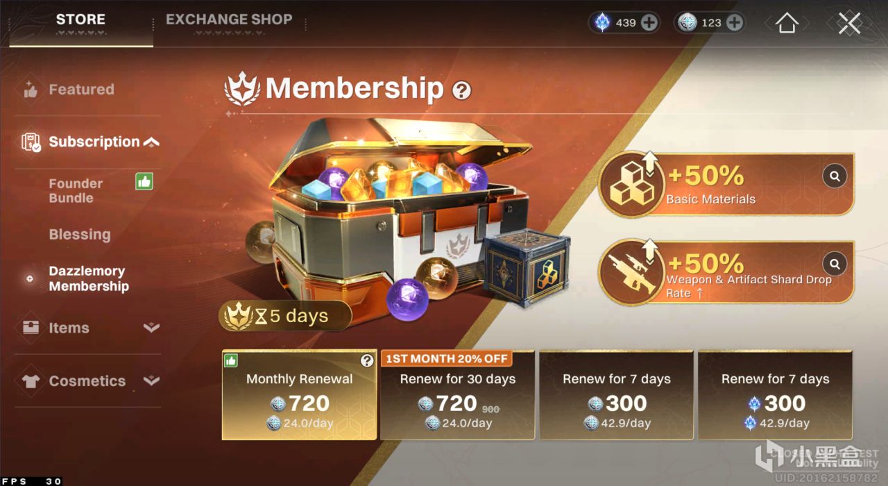 除此之外,這裏還有一個會員,可以提高基礎材料和槍械掉率50%,初一看感覺很新、很坑,但如果你仔細思考,這個功能就等同於其他手遊的氪金買體力,因爲命運崛起是不能像米哈遊一樣用抽卡代幣買體力的……這是一把雙刃劍,好處是買體力後你還要花額外的時間和精力去肝,而提高額外掉率就把這一部分額外的時間和精力節約了下來;但與此同時,買體力我可以根據我的需求自己決定每天買多少體力、是否買體力,而這個會員你只能決定這個月買或者不買,並且固定是體力提高50%(收益提高50%即等同於體力提高50%)。