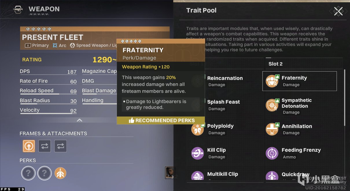 武器perk大部分來自命運2,但是有一部分是命運崛起原創perk,比如上圖的兄弟會:全部火力戰隊成員存活時提高20%(PVP中效果大幅降低),不排除這些perk未來會反哺命運2的可能……武器perk也分爲神話、傳說、精良三個等級,不太清楚是否有權重……