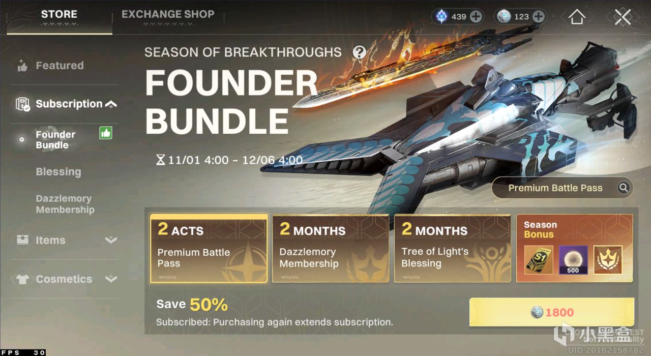 此外這裏還有一個創始人禮包,可以以5折的價格購買2個月的小月卡+大月卡+會員,等於一個月900銀幣(可能約90元),只是不知道這個是開服(突破賽季,Season of Breathroughs)專屬的,還是你每次都能半價買兩個月,筆者個人認爲這個只是單純的開服福利,後續的話每個月三個全買就是300+600+720(會員續費打8折)合計1620銀幣一個月(可能約162元)。