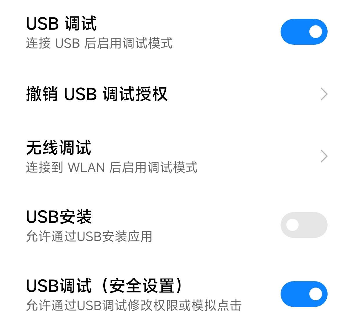 2.找到開發者選項,依次開啓“usb調試”“usb調試安全設置”,隨意連接一個wifi後進入“無線調試”