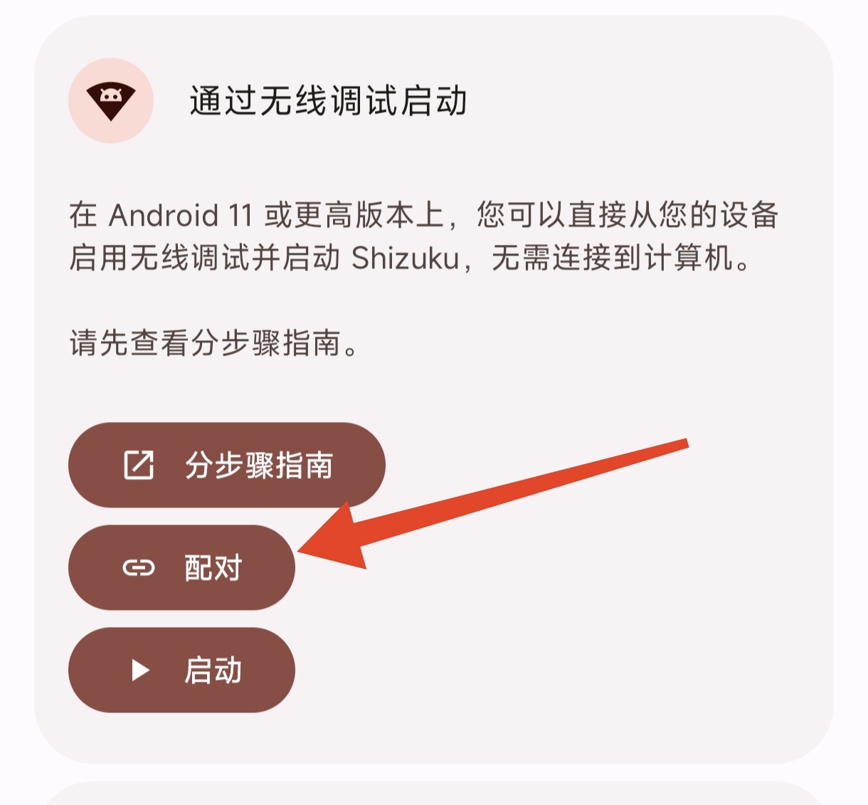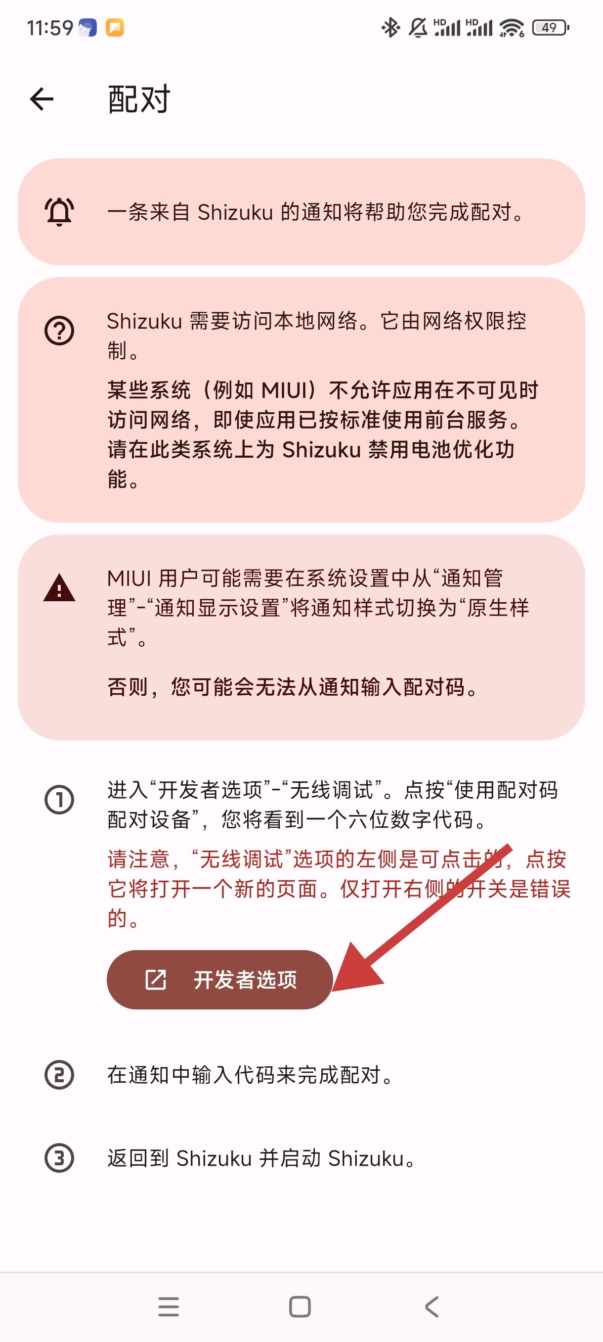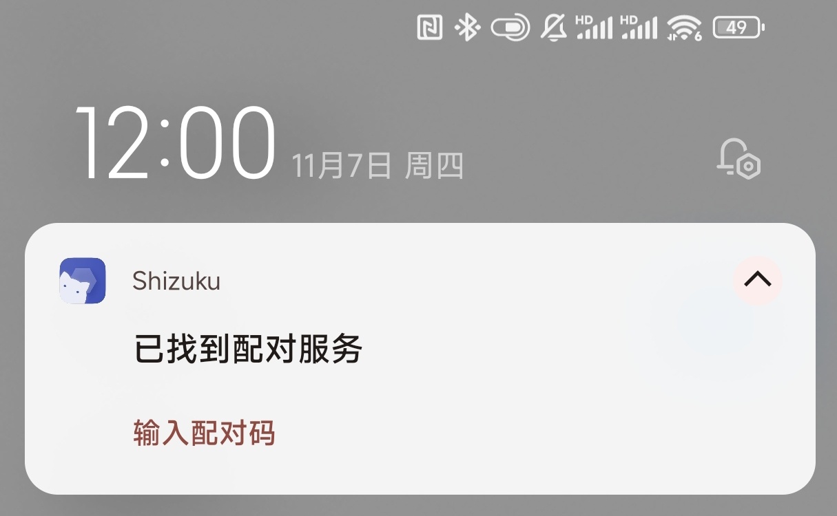 3.打開shizuku進行配對,點擊配對裏的開發者選項或者切後臺回到無線調試界面,點擊“使用配對碼配對設備”,獲得配對碼後在通知欄界面輸入配對碼,配對成功