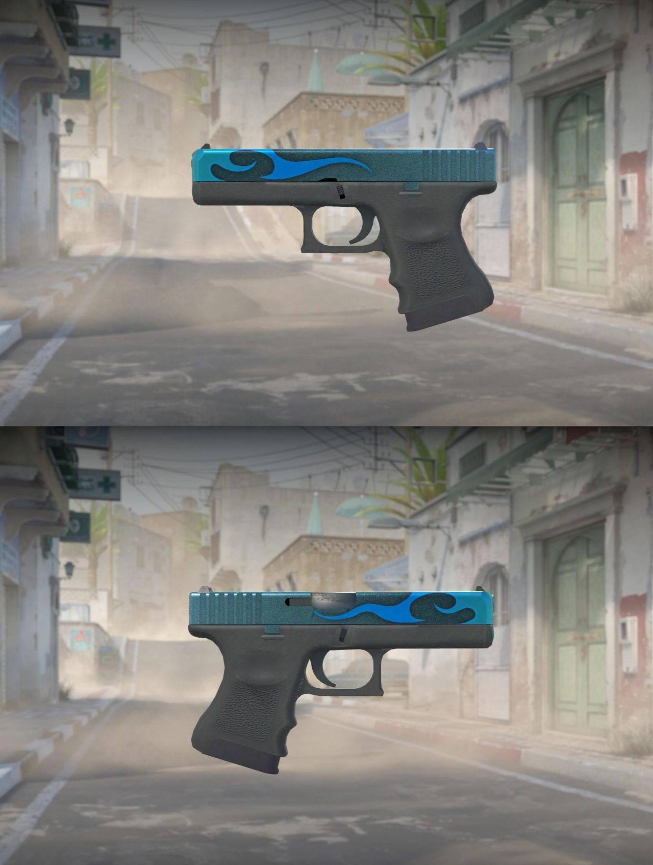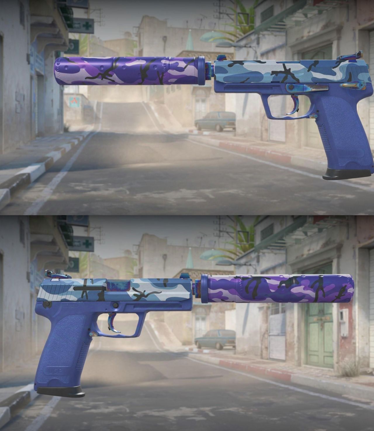 設計這把槍的人真是個天才,藍紫配色,搭配迷彩圖案,特殊模板紐扣扳機各處均有淬火處理,可以挑一把紐扣全藍的,不過沒有必要爲了那點淬火花大價錢去挑,價格合適就好,磨損影響圖案完整和光澤,推薦極限久經。