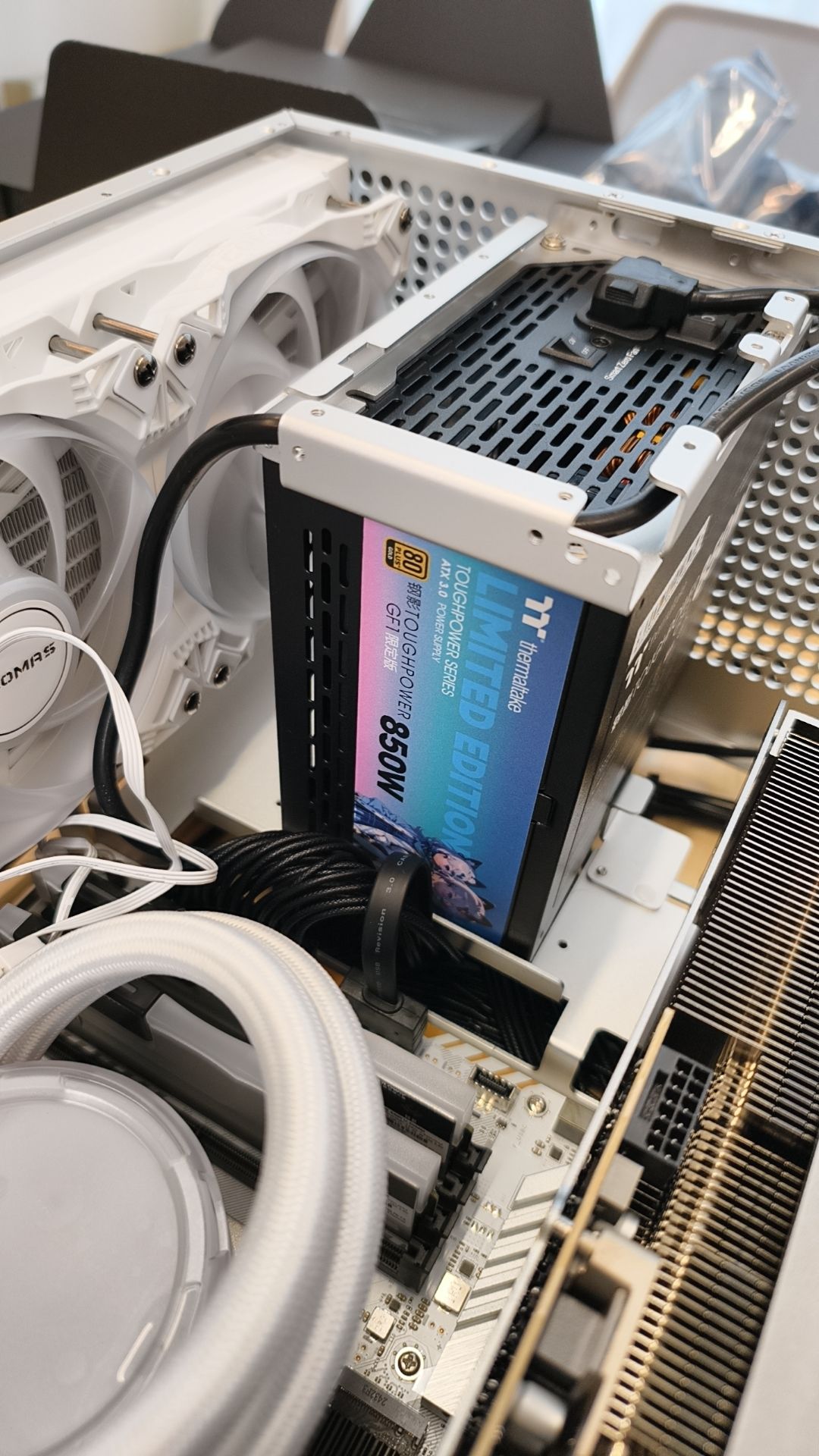 但是也還是有點小問題,像我這個電源爲了水冷選擇中置的方案,結果發現到了之後放置方向這個二次元貼紙會倒過來,就離譜。