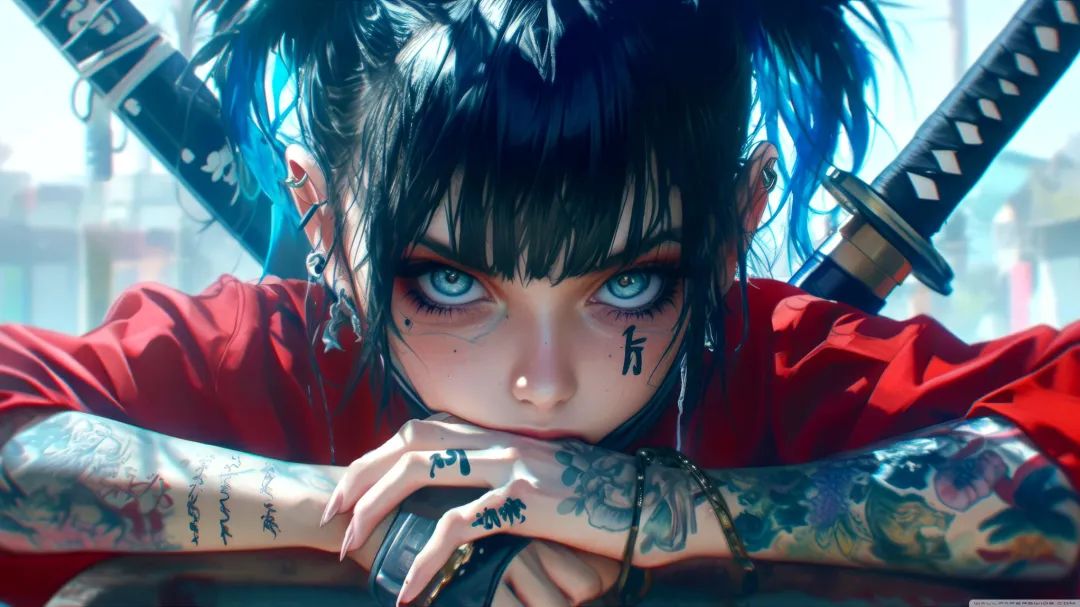 她劍指前方,眼神堅毅,藍色彩繪點綴臉龐,城市高樓成爲她的戰場背景,盡顯都市戰士的英姿