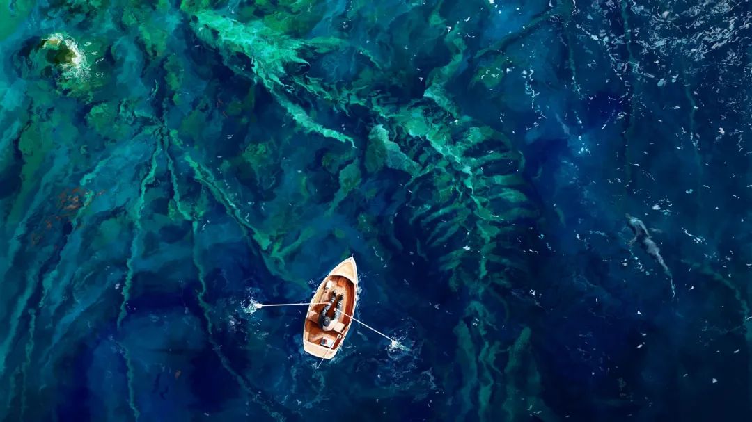 在這片寧靜的海面上,一艘小船悠然劃過,如同漂浮在藍色的夢境之中。陽光灑在海面,波光粼粼,彷彿無數鑽石閃耀着光芒,照亮了整個世界。