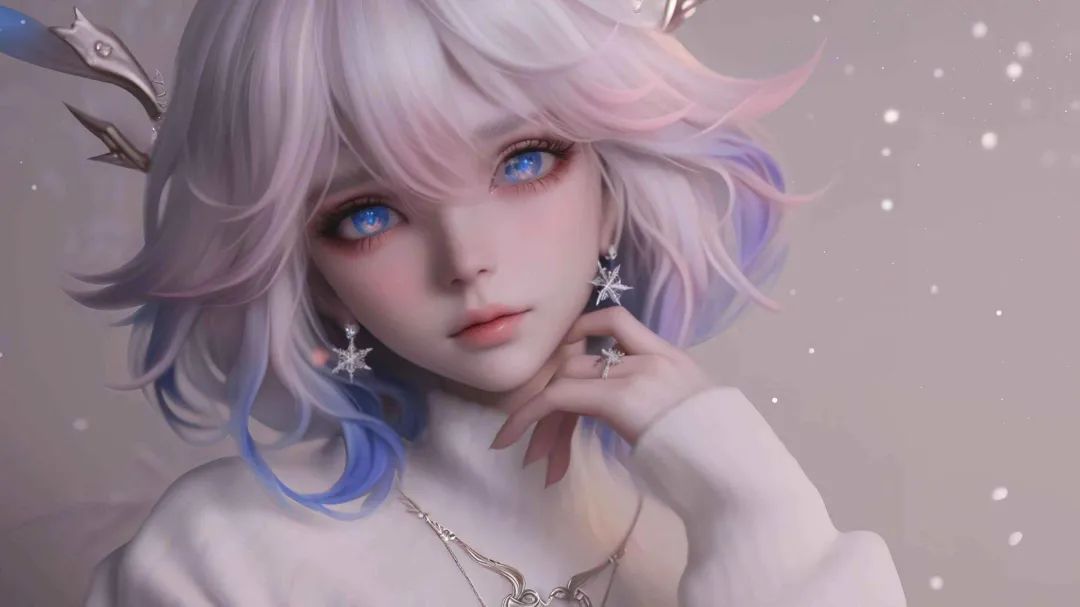 美丽的动漫女孩,她有着白色的短发,蓝色的眼睛。她的头上戴着一对鹿角和一个蓝色的头饰,右边的头发上还别着一个银色的发夹。她穿着一件白色上衣,戴着雪花图案的耳环和项链,左手托着下巴,展现出优雅的姿态。