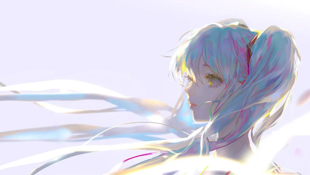 阳光透过云层洒下,为她的蓝色长发渡上一层金边,微风轻拂,发丝随风舞动,仿佛是天空中的流光溢彩。