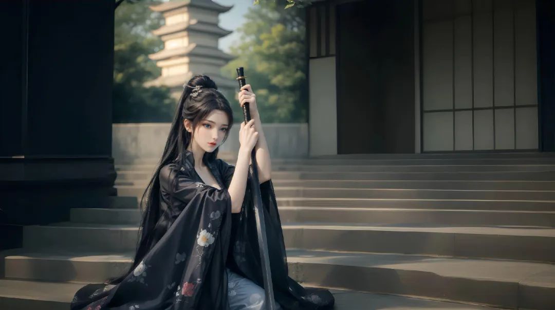 穿着黑色汉服的女子坐在石阶上,手持一把剑。她的头发被扎成一个高高的发髻,头上插着精美的发饰。她看起来很专注,仿佛在思考什么。背景是一座古老的建筑和一些树木。