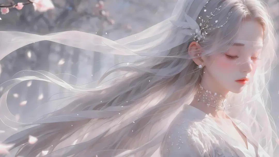 穿着白色连衣裙的白发女孩坐在蓝色的水中,她的裙子看起来像是由花瓣组成,她背上有一对翅膀,显得纯洁而优雅。