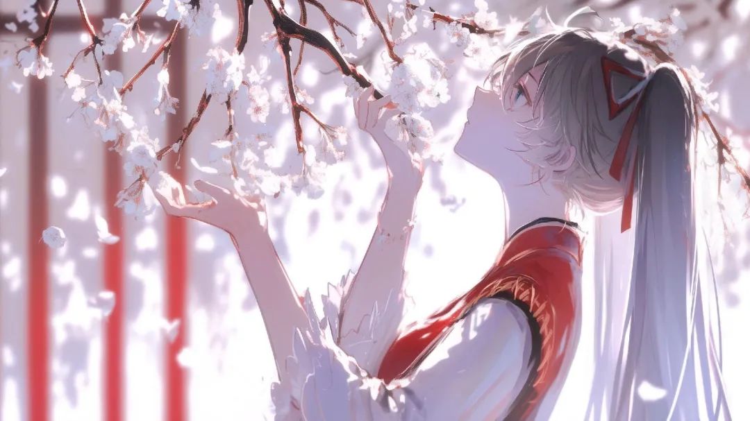 樱花树下,一位穿着红色外衣、白色裙子的动漫女孩正抬头看着漫天飞舞的花瓣,微风轻抚,她的马尾辫随风飘扬,阳光透过花瓣洒在她的脸上,让她看起来更加美丽动人。