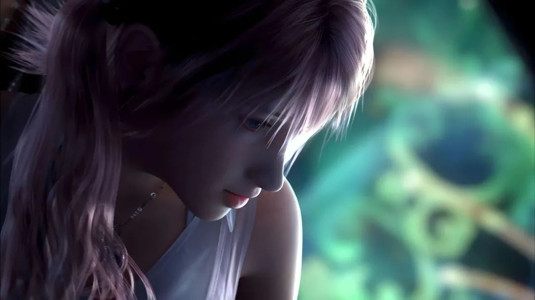 粉色头发的女性侧脸示人,她的眼神似乎在凝视远方或沉思着什么。她穿着一件白色的衣服,脖子上戴着一条项链,背景是一片模糊的自然景色。