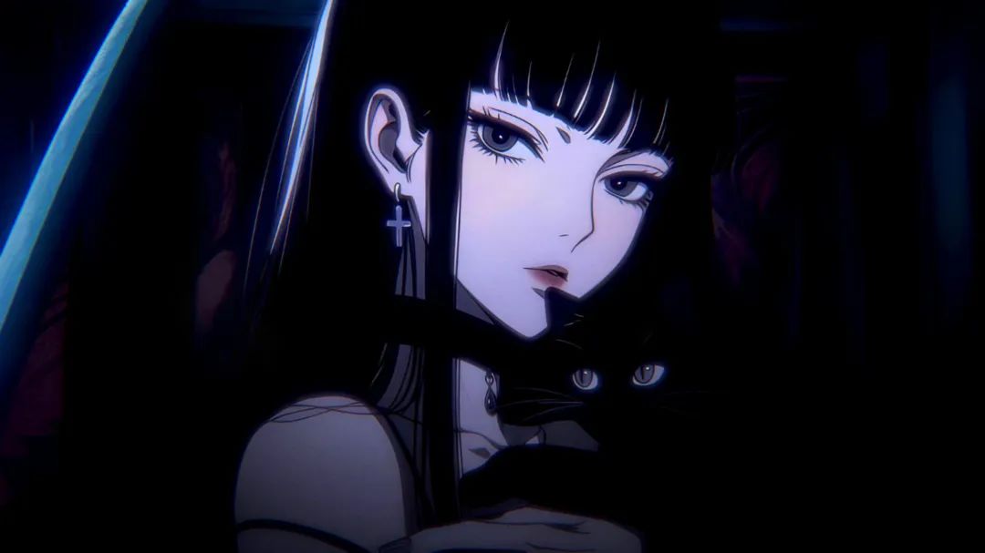 夜晚,一位黑長直女孩抱着一隻黑貓,她的眼神深邃而神祕,彷彿隱藏着無盡的祕密。