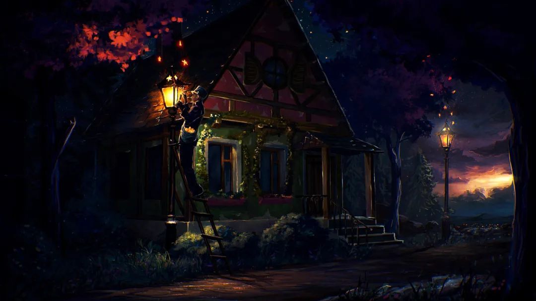 夜幕降臨城郊小路,路燈下修燈人忙碌,遠處的天空被晚霞映紅,美得讓人駐足欣賞。