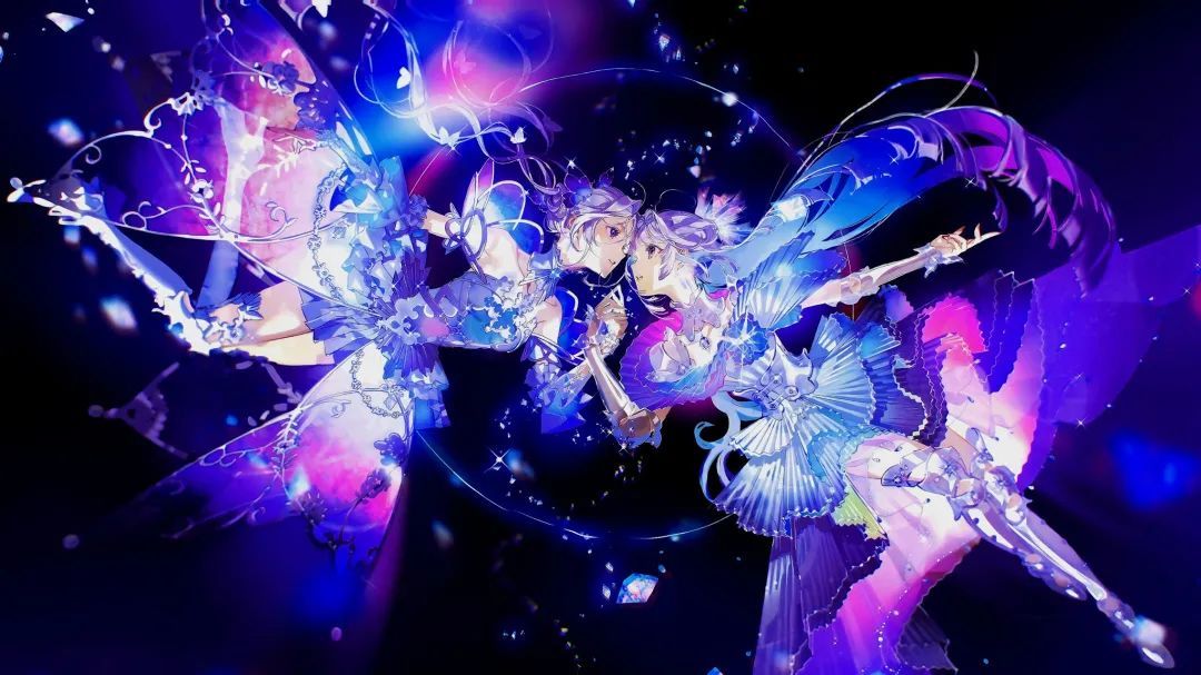 兩個動漫風女孩,周圍是深藍色的夜空和閃爍的星星,還有漫天的粉色心形氣泡。