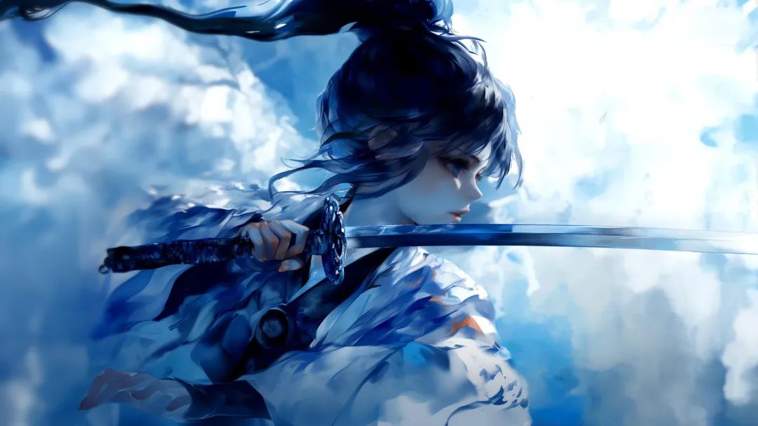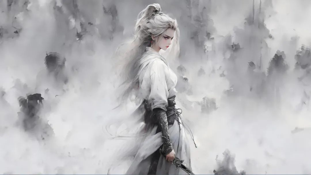 站在雲霧繚繞的山川之間,手持一把劍,目光堅定而深邃。她似乎在等待着什麼,又像是在思考着某個問題。她的身後是連綿起伏的羣山和蒼茫的天空,給人一種神祕而壯觀的感覺。