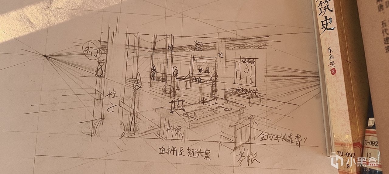 在場景設計方面,我們希望傳統的水墨風格可以更強一點,我們選擇了融合二次元和水墨畫的風格,我們通過查找一些中國古建築的書籍,先去採用手繪,畫一個包含透視關係和各種元素的概念圖。