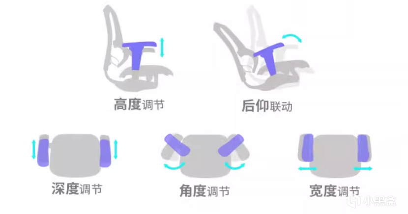 调节:头枕调节、扶手调节、腰托调节、腰枕调节、底盘高度调节、椅背高度调节、整体后仰调节等等,对于人体工学椅而言,尽量适配最广泛的人体尺寸与姿态,是关键点之二。