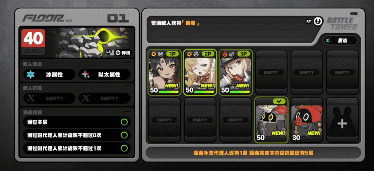 在這一玩法中,玩家可以不去“走格子”,享受單純的爽快戰鬥,高塔每五小層爲一大層,在一大層內代理人的血量不會恢復,玩家需要對應每層的敵人屬性配置合理的陣容,完成固定的25層挑戰後,還將進一步解鎖無盡模式,對抗逐漸變強的敵人,挑戰自己的極限。