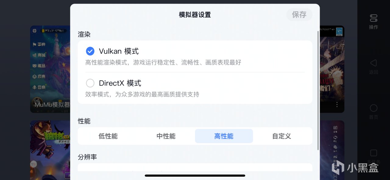 其中,模拟器设置能对渲染模式、性能以及分辨率三样东西进行调整