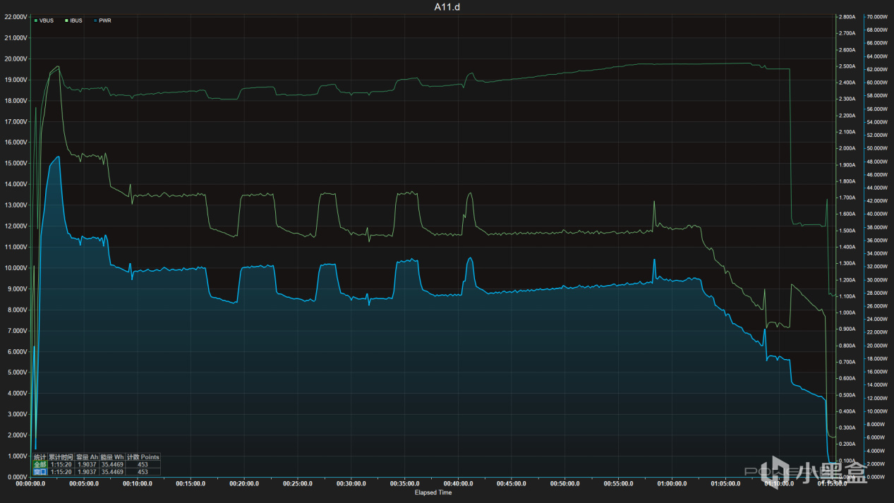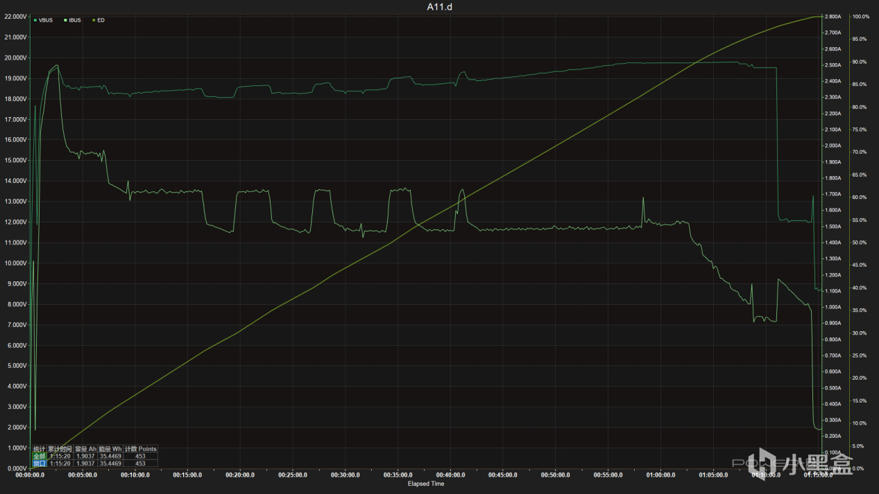 一開始攀升到48W,隨後立即降到36W,到一個小時基本維持在28-33W之間,62分鐘後緩慢下降,70分鐘UI滿電,75分鐘功率歸零