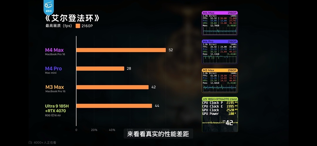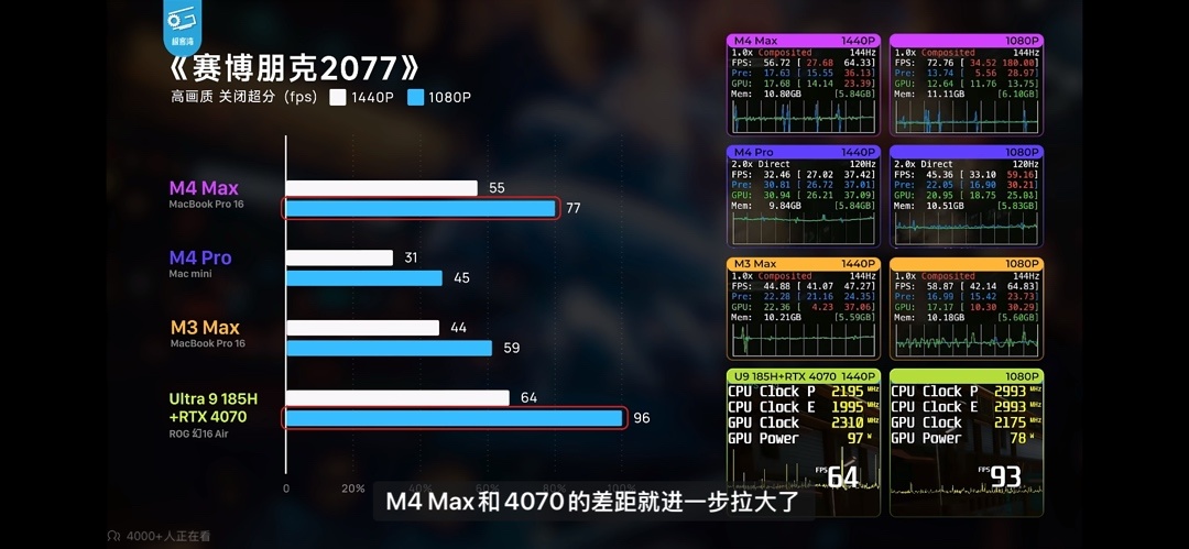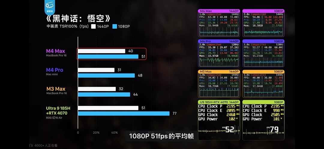 在这移植到MAC的原生游戏,博德之门3和生化危机4重制版中,M4 MAX的表现堪称惊艳啊,无论是2K还是1080p都领先于4070移动端!