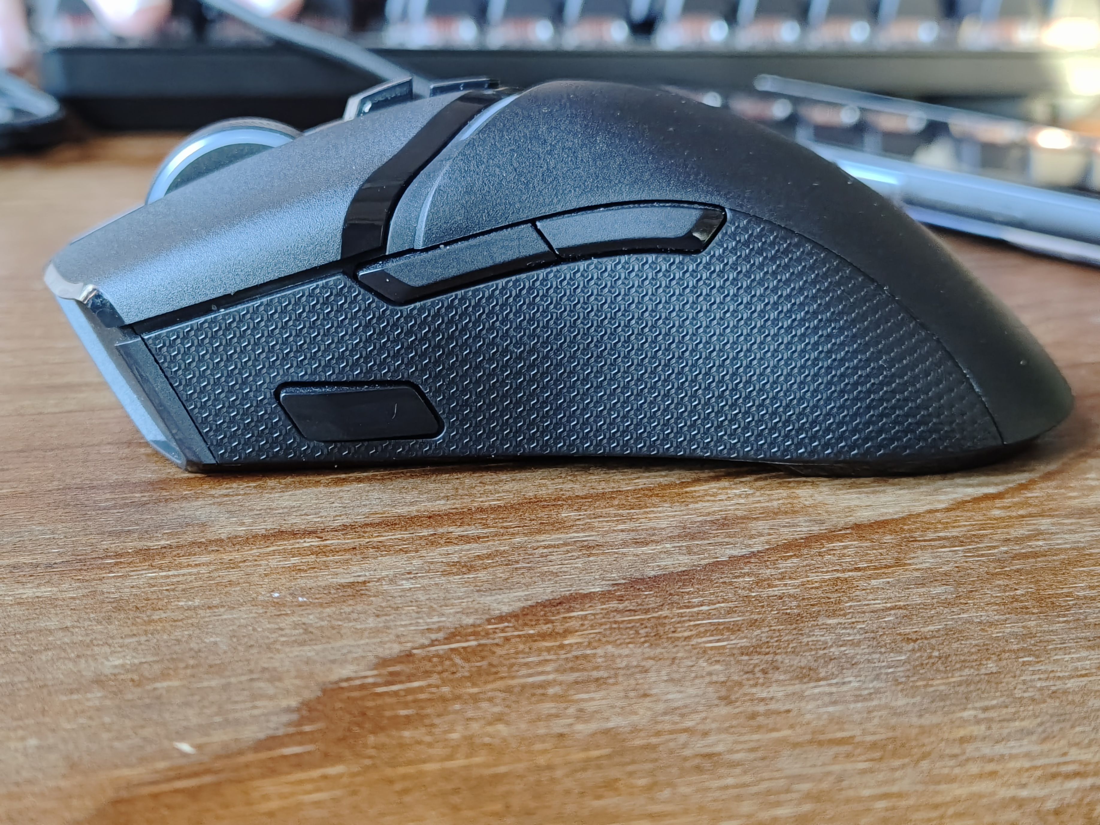 他的侧键和502一样 有个狙击键,不过那是给大手玩家用的,我17.5的中手手指头是摸不到这个键的,摸到了,我的握持姿势就变型了。