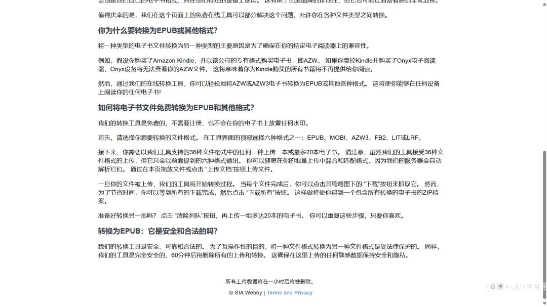 该网站支持36种文件格式中的任何一种,同时上传最多可同时操作20本电子书,非常方便和省事,所上传的书籍或文档也会在60分钟后全部删除,无需担心泄露和安全相关。