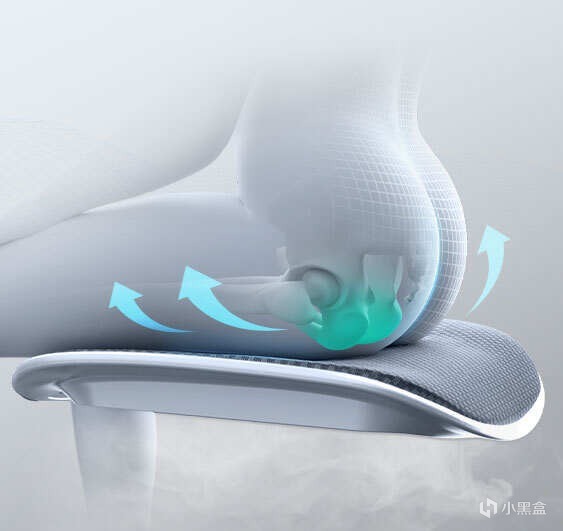 ⑤6D可調節懸浮扶手,前端上翹能緩解玩手遊、刷手機時小臂和肘部壓力。