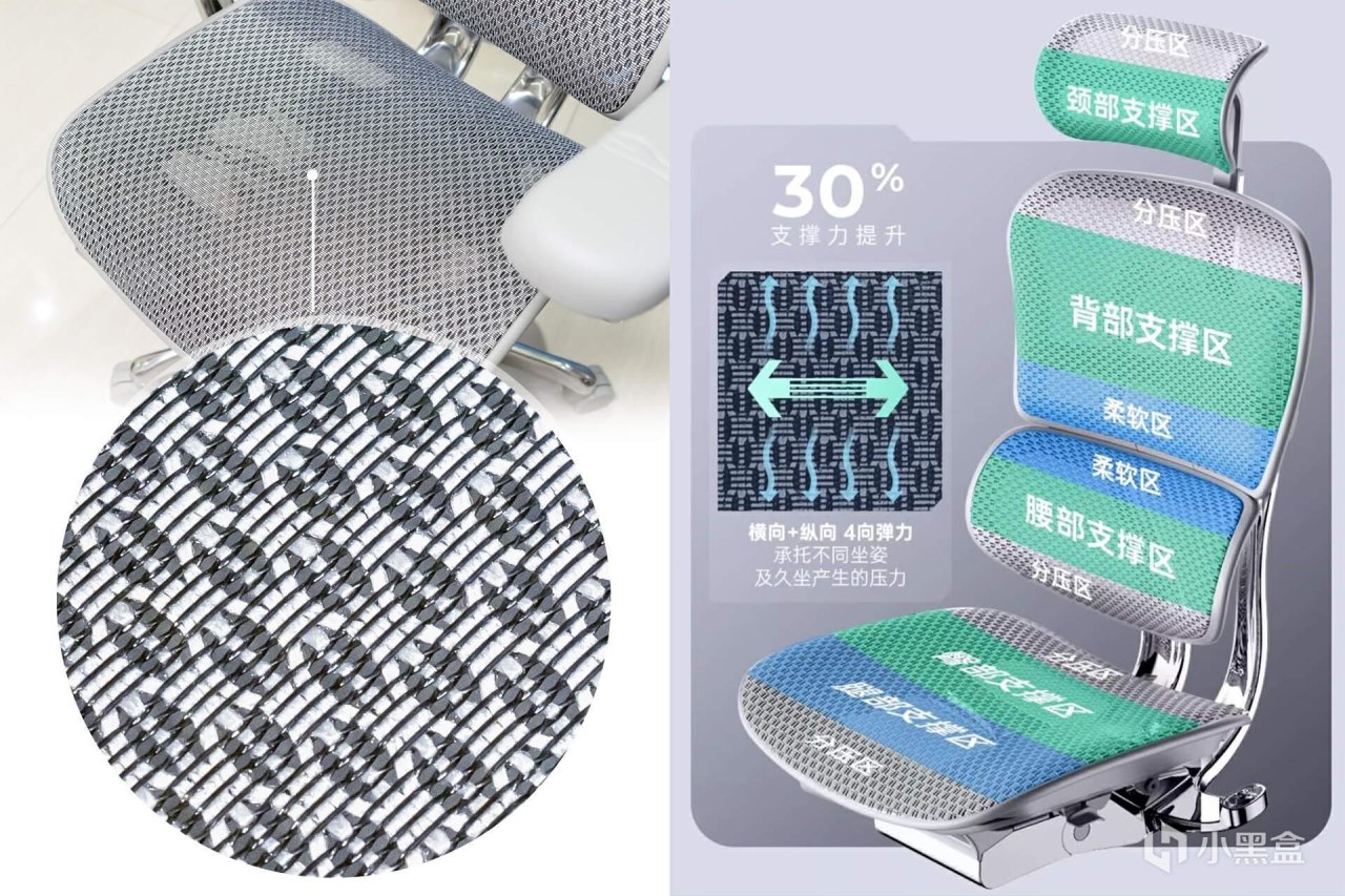保友金豪e 2代的椅面根據人體結構設計了12個不同張力的橫向和縱向區域,有針對性的對脖頸、肩膀、背部、腰部、臀部、腿部等不同部位採取分壓支撐,能科學釋放身體對腰椎、頸椎產生的壓力,有效緩解久坐疲勞。