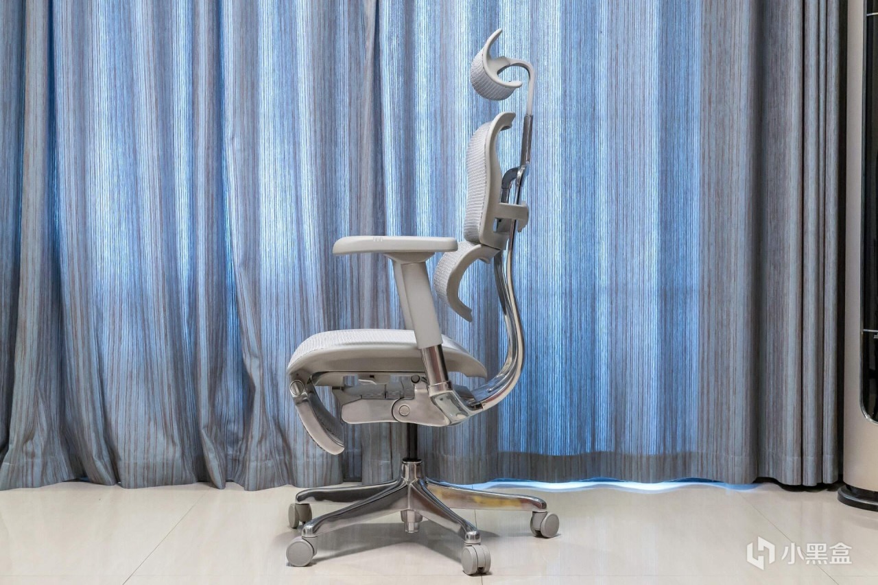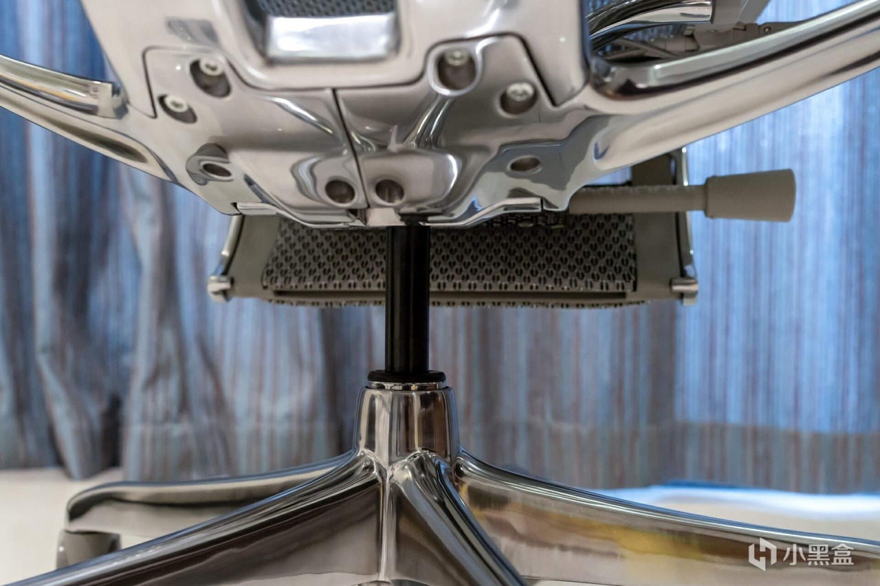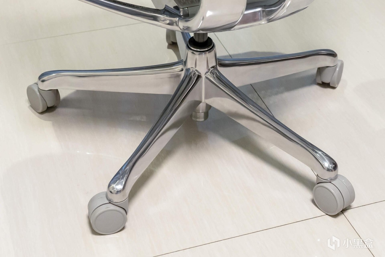 從側面看,保友金豪e 2代的骨架呈S型彎曲,看着略顯單薄,但你可不能被它的外觀“欺騙”。這把椅子的骨架和腳椅都是鋁合金材質,表面採用精拋光+鏡面工藝處理,精緻又美觀,所以才讓它有種“單薄”的錯覺。其實,鋁合金部位的用料很足,又是一體成型製造,有足夠的硬度和強度,承重能力自然不會差。