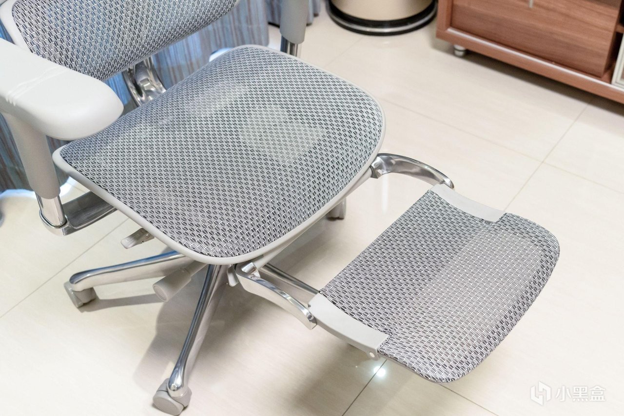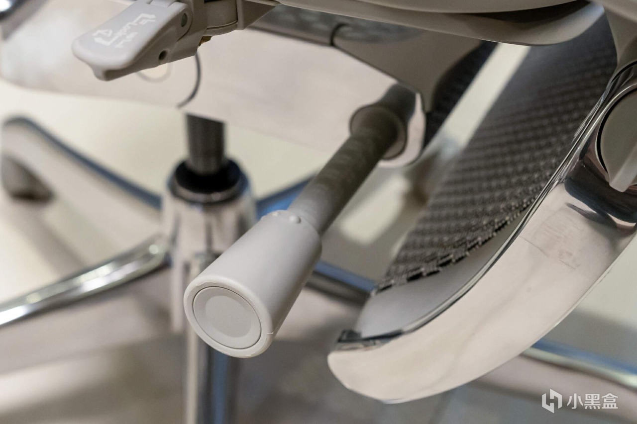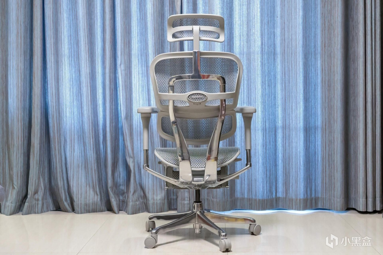 從側面看,保友金豪e 2代的骨架呈S型彎曲,看着略顯單薄,但你可不能被它的外觀“欺騙”。這把椅子的骨架和腳椅都是鋁合金材質,表面採用精拋光+鏡面工藝處理,精緻又美觀,所以才讓它有種“單薄”的錯覺。其實,鋁合金部位的用料很足,又是一體成型製造,有足夠的硬度和強度,承重能力自然不會差。