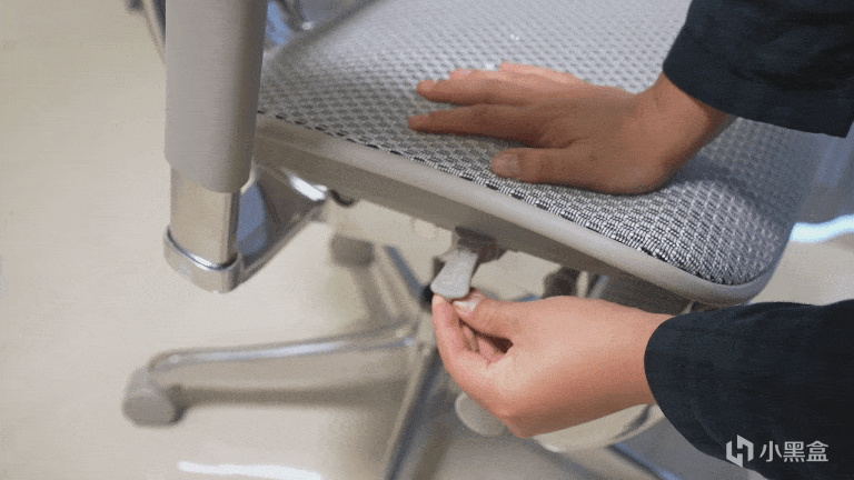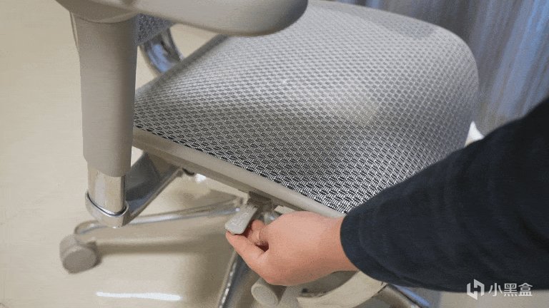 撥檔向前扳,調整座深。保友金豪e 2代的座墊前沿採用流瀑式人體工學設計,座墊可根據我們的坐姿和身體活動前後調節座深,減少對腿部的壓力,久坐也不會麻腿。