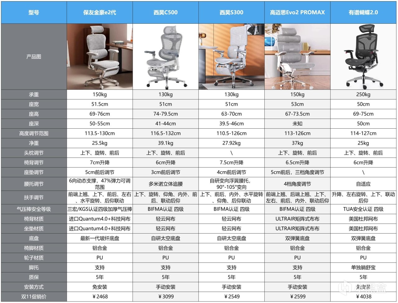 接下來就到了橫向對比的環節,我把保友金豪e 2代、西昊C500、西昊S300、高邁思Evo2 PROMAX、有譜蝴蝶2.0這5把椅子的主要參數列了一個表格,大家可以參考一下。