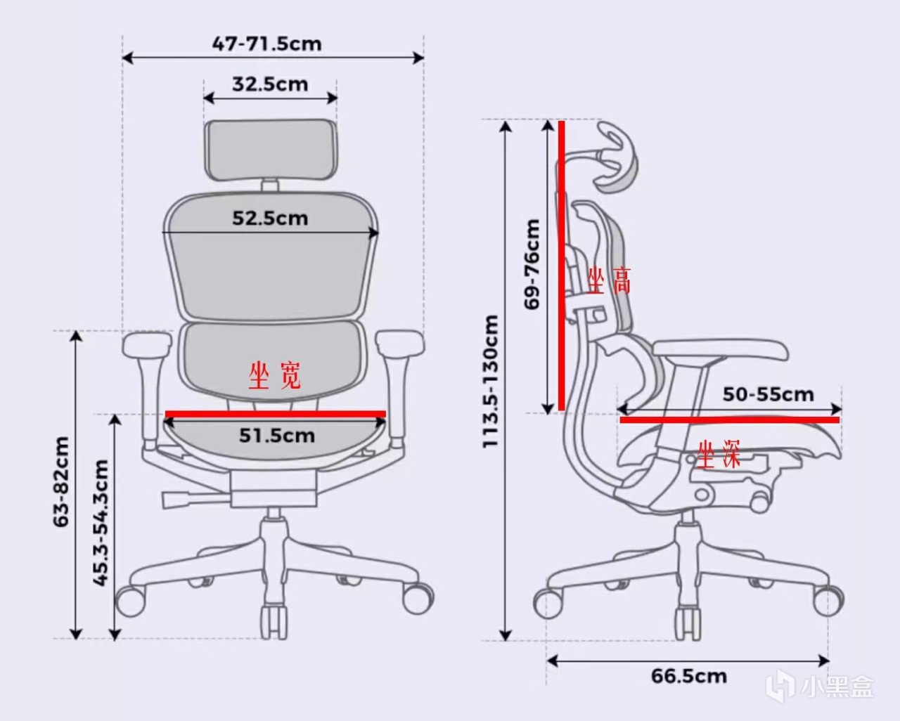 參照下圖,坐寬對應椅子的寬度,坐深對應的是座墊最大橫向長度,坐高對應的是背部高度調節範圍。參考尺寸數據時要注意,我們的坐高、坐寬應小於人體工學椅的尺寸,而坐深要大於人體工學椅的尺寸,同時,最好選擇坐高、坐深可調節的人體工學椅,適配性更高。