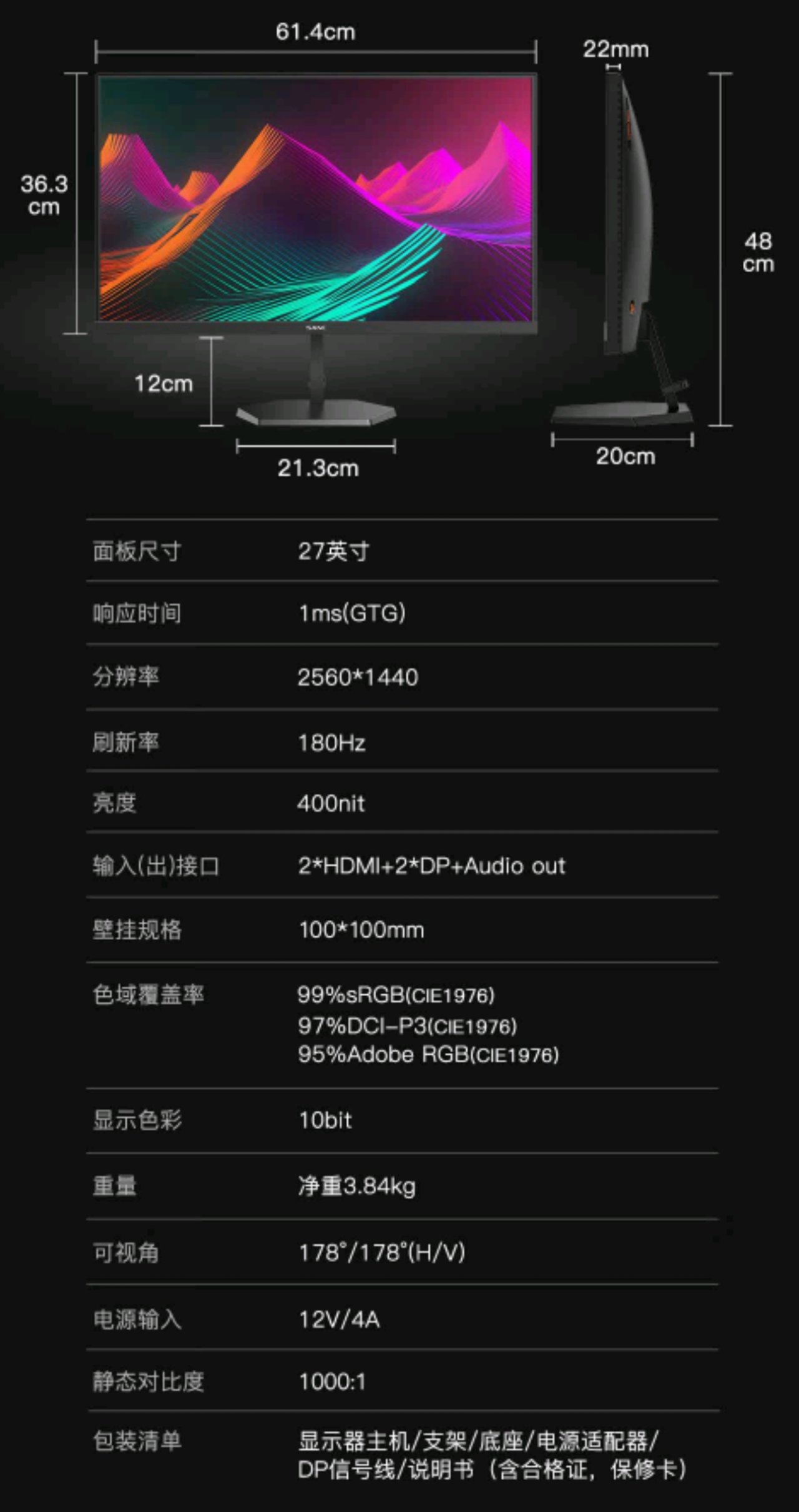 搭載27英寸2K ips 屏幕,180hz 高刷,廣色域。