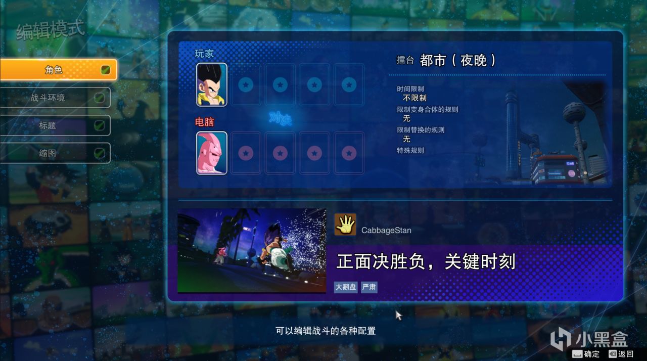其中本作最颇具特色的便是「自订战斗」。也就是说你在此可以体验到各路民间高手的自定义战斗情节,比如黑悟空VS贝达、巴达克VS“费利萨,还有五个百亿能量战士围着一个AI卡贝的饭制剧情。