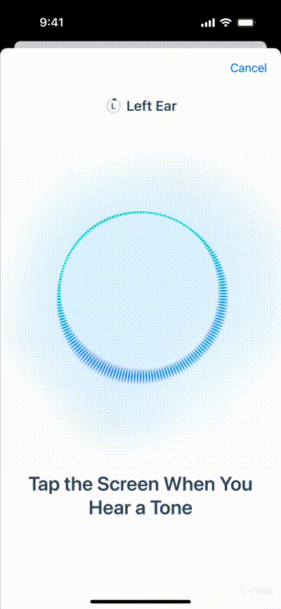 2.聽到提示音,點擊屏幕。該測試使用基於先進聲學科學的純音測聽技術,播放一系列音調,您只需輕點屏幕即可響應這些音調。有用的動畫、點擊後退效果和進度指示器將指導您完成整個體驗,大約需要 5 分鐘。超過 150,000 個真實世界的聽力圖和數百萬次模擬幫助開發了準確、快速和簡單的聽力