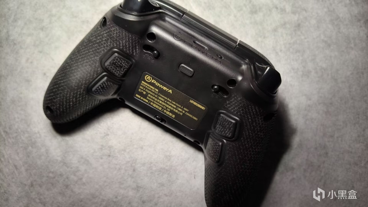 握把處做了包膠,防滑紋是powera的LOGO紋,很有特色,四顆拓展鍵都在握把處,上方是一個三段式的扳機鎖調節扳機的鍵程,回報率方面不錯,有線1khz無線也保持在500hz,整體重量很均衡,握在手裏壓力不大。